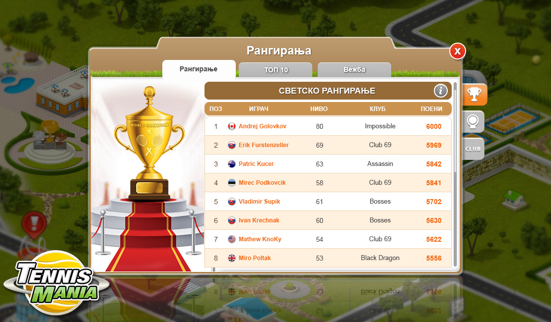 Доживи узбуђења професионалне тениске каријере у спортској менаџерској и симулацијској игри Tennis Mania. Играј против изазовних противника који ће тестирати не само твоје рефлексе, већ такође и твоје стратешко размишљање! Зафркни их лукавим дроп-шотом! Застраши их истрчавањем на мрежу и играњем "лицем у лице"! Запањи их асом, брзим као метак! Све од тебе зависи!